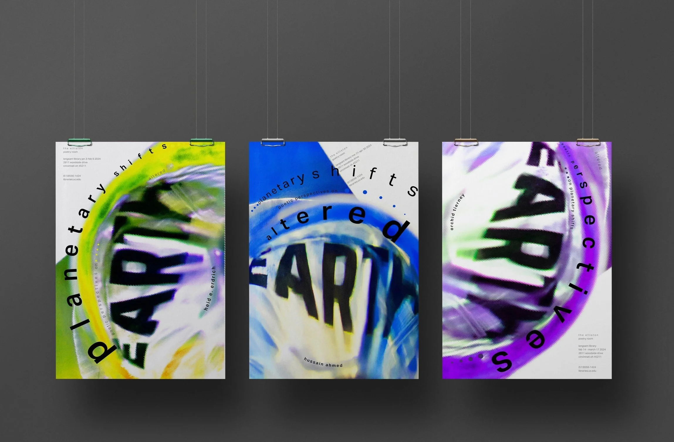 A series of cohesive posters utilizing typography, photography, and color to advertise three poetry events and poets. The general theme of the poetry was: Altered Earth and Poetic Perspectives on Planetary Shift.